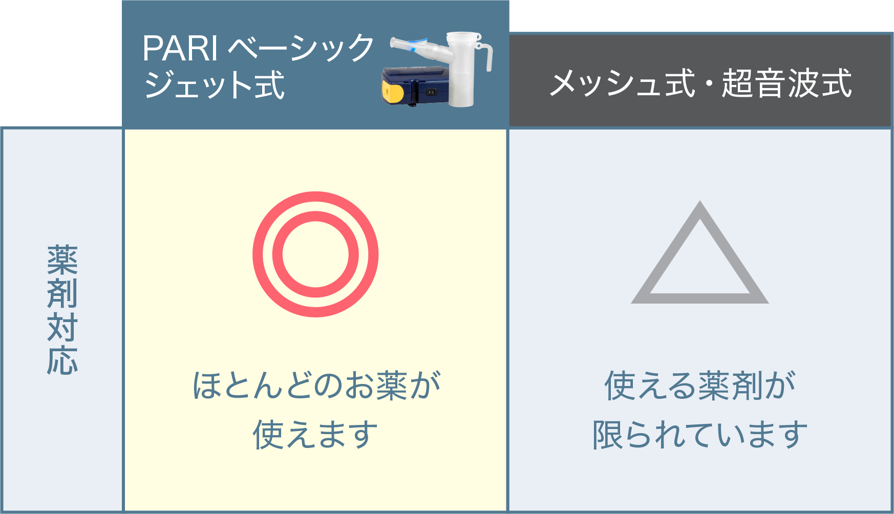 メッシュ式や超音波式は使える薬が限られていますが、ジェット式はほとんどの薬に対応しているため、安心してお使いいただけます。